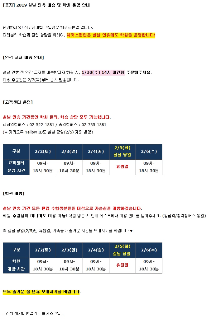 [공지] 2019 설날 연휴 배송 및 학원 운영 안내