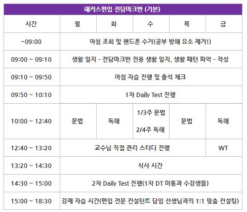 강의일정 | 아침반 : (월~금) 7:10 ~ 9:40 | |