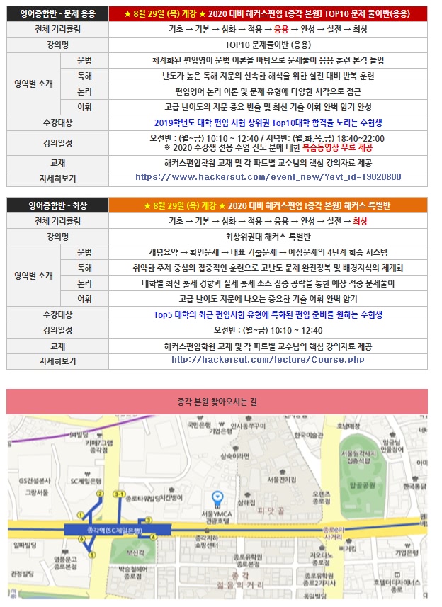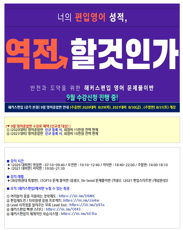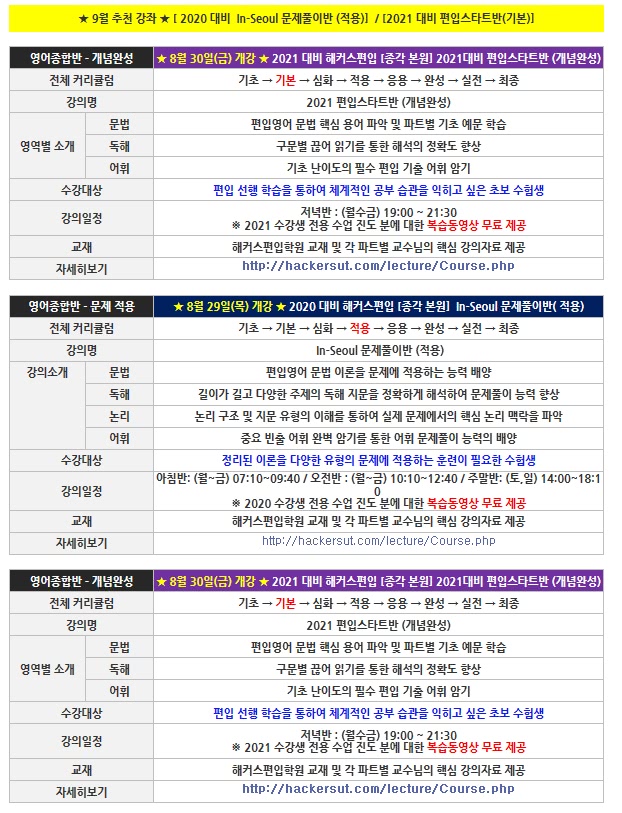 해커스편입 [종각 본원] 9월 영어종합반 大개강 <주중반 8/29(목), 주말반 8/31(토) 개강>