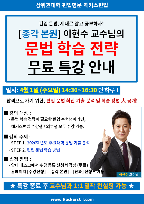 [해커스편입] 종각 본원 ★ 4/1(수) 문법 학습 전략 무료 특강 ★