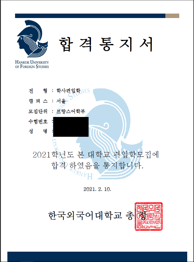 정말 믿기지가 않습니다. 정시나 수시로는 엄두를 내지 못했던 대학을 갔다는 게 행복합니다. 서성중 1차를 붙었다는 것도 믿기지 않습니다. 결국엔 독학사 성적을보지 않는 한국외국어대학교만 최종합격했지만 이정도로 만족하려고합니다. 만약 편입을 생각하고 계시다면 전적대 성적도 많이 중요한 것을 인지하고 계시길 바랍니다. 제 독학사 성적이 그렇게 좋지 않았거든요. 편입 준비하시는 분들 파이팅입니다. |