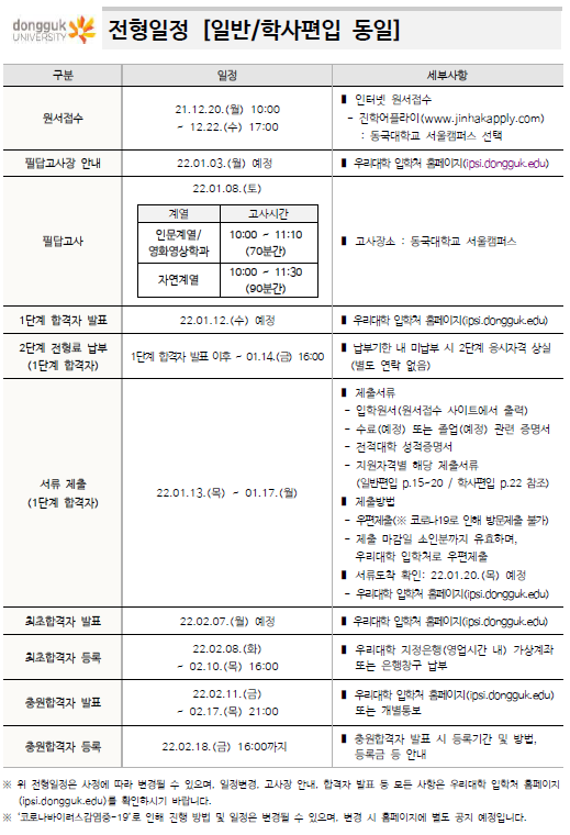 2022학년도 동국대학교 편입학 최종 모집요강 안내드립니다.