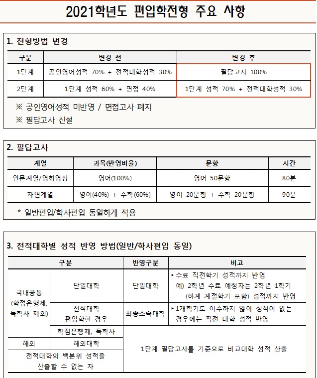 2021학년도 동국대 편입학 전형방법 변경사항 안내드립니다.